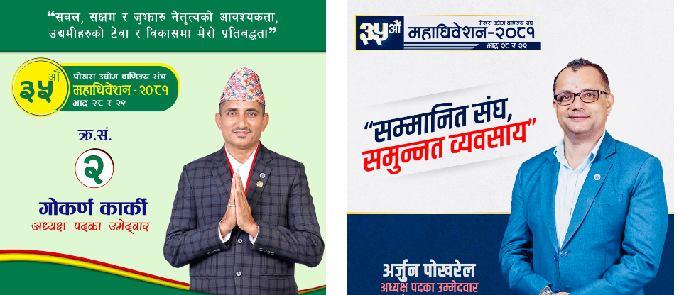 पोखरा उद्योग वाणिज्य संघका अध्यक्ष पदका उम्मेदवार गोकर्ण कार्कीले देशमा अहिले व्यापार÷व्यवसाय गर्ने अवस्था नभएको बताएका छन् । अधिकांश युवा विदेशीने र स्वदेशमै केही गरौं भन्ने युवा समेत बैंक र वित्तीय क्षेत्रमा आएको समस्याका कारण व्यवसाय छाडेर जानुपर्ने स्थिति आएको र यसको अन्त्य गर्नुअत्यावश्कय रहेको बताएका छन् । ‘बैंक, वित्तीय क्षेत्रका समीयाहरुको उचित निकासको लागि नियामक निकायहरुसँग प्रतिफल आउने गरी काम गर्छु’ कार्कीले भने, ‘हिजो बैंकको चर्को ब्याजरदका कारण आम उद्योगी, व्यापारी, व्यवसायीले निकै कष्ट भोग्नुपरेको छ । मेरै नेतृत्वमा बैंक ब्याजदरको विरुद्धमा विभिन्न ध्यानाकषर्ण गर्ने काम भयो अब नेतृत्वमा बसेर अझ सशक्त हुने चाहाना छ ।’
