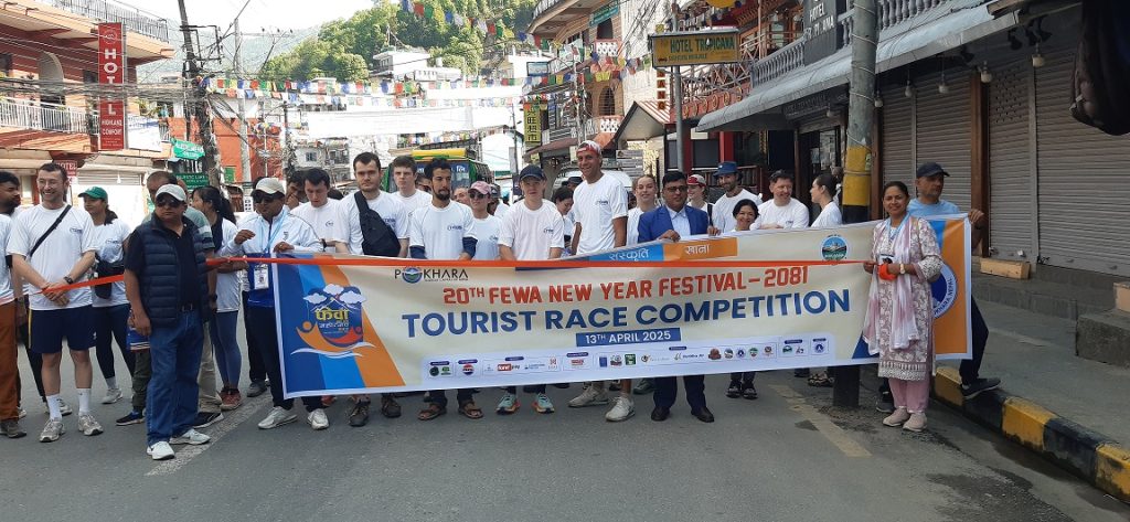 पोखरामा जारी २० औं फेवा नव वर्ष महोत्सव २०८२ को दोश्रो दिन आइतबार लेकसाइडमा आयोजित पर्यटक दौड प्रतियोगितामा लण्डनबाट आएका साम प्रथम भएका छन् ।